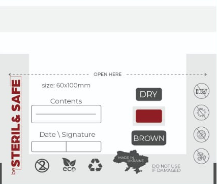 - Pre-applied sterilization indicator (Class 4), which easily indicates whether sterilization has been properly performed. If the sterilizer works correctly, the indicator changes color (e.g., from beige to purple).