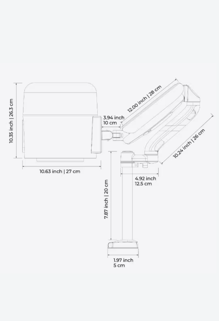 - Dizainas: cilindro formos ergonomiškas korpusas, skirtas intuityviam/paprastam valdymui; valdymo įtaisai ant korpuso (atsižvelgiant į darbą su pirštinėmis), patogus tvirtinimas ant lankstinės priešsvaros svirties patogiam kampo reguliavimui geresniam siurbimui ir apšvietimui, stalo tvirtinimo sistema reikalauja tik 10 cm² darbo vietos krašte (manikiūro stotelė), pasirinktinė tvirtinimo galimybė ant ratukų stovo perkėlimui (pedikiūro stotelė).