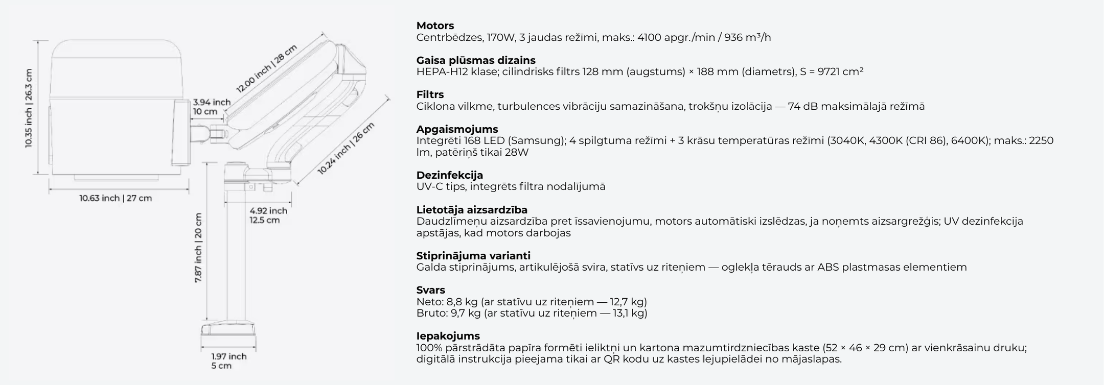 - Filtras: HEPA-H12 klasė; cilindro formos 128 mm (aukštis) x 188 mm (skersmuo), S=9721 cm².