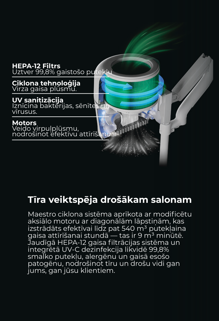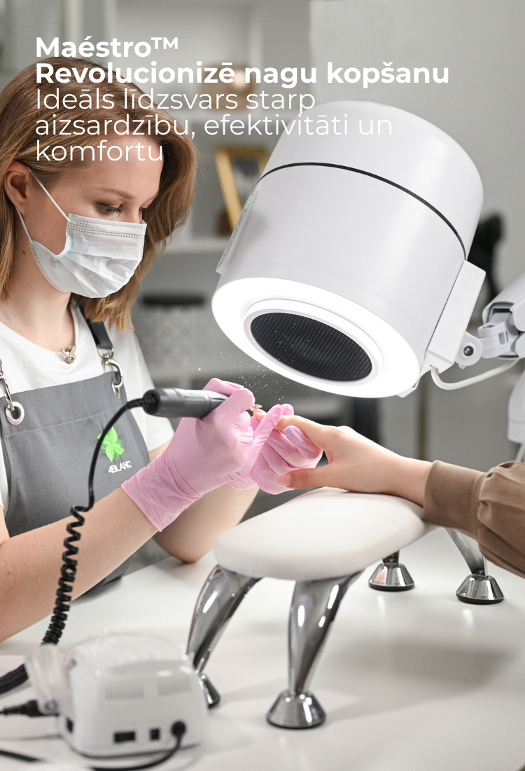Maestro Ultimate Protection Nail Station iš 4BLANC® unikalus derinys efektyvumo ir sveikatos apsaugos meistrams bei klientams. Kompaktiškoje įrangoje įmontuotas dulkių surinkėjas, reguliuojamas apšvietimas ir UV dezinfekcija. Ilgalaikė sveikatos ir darbo aplinkos komforto išlaikymas manikiūro/pedikiūro procedūrų metu, užtikrinant saugesnę ir efektyvesnę procedūrų aplinką. Maestro siūlo neprilygstamą darbo vietos švarą ir kvėpavimo saugumą su ciklonine dulkių surinkimo sistema, HEPA12 oro filtru, kuris sulaiko 99,7% mikrodalelių, ir UV dezinfekcija, kad būtų pašalinti nuolatiniai patogenai. Lankstūs montavimo variantai ir didelė siurbimo galia apibrėžia Maestro unikalų universalumą, naudojant nagų ir pedikiūro/podologijos Smart-Disc kojų priežiūros procedūroms. Privalumai apima sumažintą profesinę sveikatos riziką (ypač: plaučių ligas, alergijų vystymąsi, akių ligas), žymiai pagerinant nagų meistrų darbo komfortą ir tuo pačiu taupant darbo vietą. Maestro sukuria mažesnį triukšmą, nesumažindamas siurbimo galios, gerina klientų komfortą ir taip didina bendrą efektyvumą, produktyvumą ir kiekvienos procedūros pasitenkinimą.