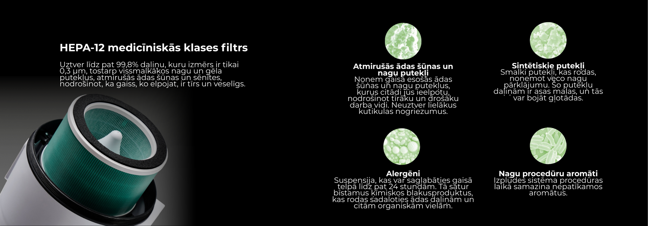 Užtikrinkite geriausią oro kokybę, reguliariai keisdami filtrą — jis sukurtas veiksmingam smulkių dulkių dalelių sulaikymui.