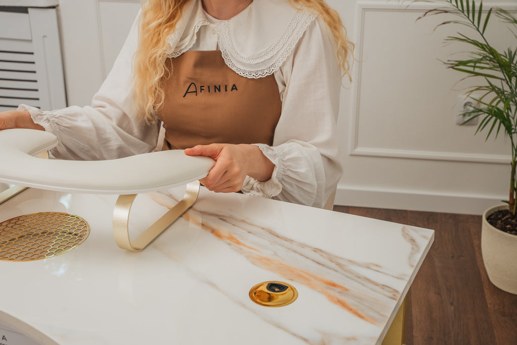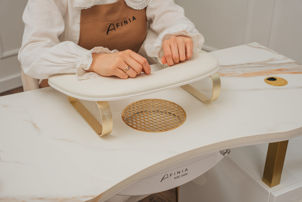 Stilīgs un funkcionāls roku balsts, kas izstrādāts, domājot gan par meistara, gan klienta ērtībām. Tā ergonomiskā konstrukcija nodrošina stabilu un ērtu roku atbalstu, padarot manikīra un nagu modelēšanas procesu vieglāku un precīzāku. Izgatavots no izturīgiem materiāliem, kas ir noturīgi pret acetonu, augstu temperatūru un netīrumiem, nodrošinot ilgmūžīgu lietošanu un vienkāršu kopšanu.
