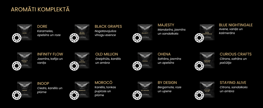 Luksuss, elegance un izsmalcinātība — Aromatic •89• automašīnas gaisa atsvaidzinātāju komplekts ar 12 populārākajiem aromātiem ir radīts tiem, kas novērtē kvalitāti un stilu.