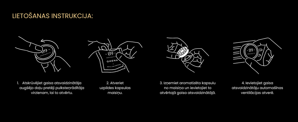Metāla, minimālistiska dizaina turētājs kļūst par smalku akcentu, savukārt izvēlētais aromāts priecē līdz pat 30 dienām. Siltāka gaisa plūsma pastiprina smaržas intensitāti, padarot katru braucienu par īpašu pieredzi.