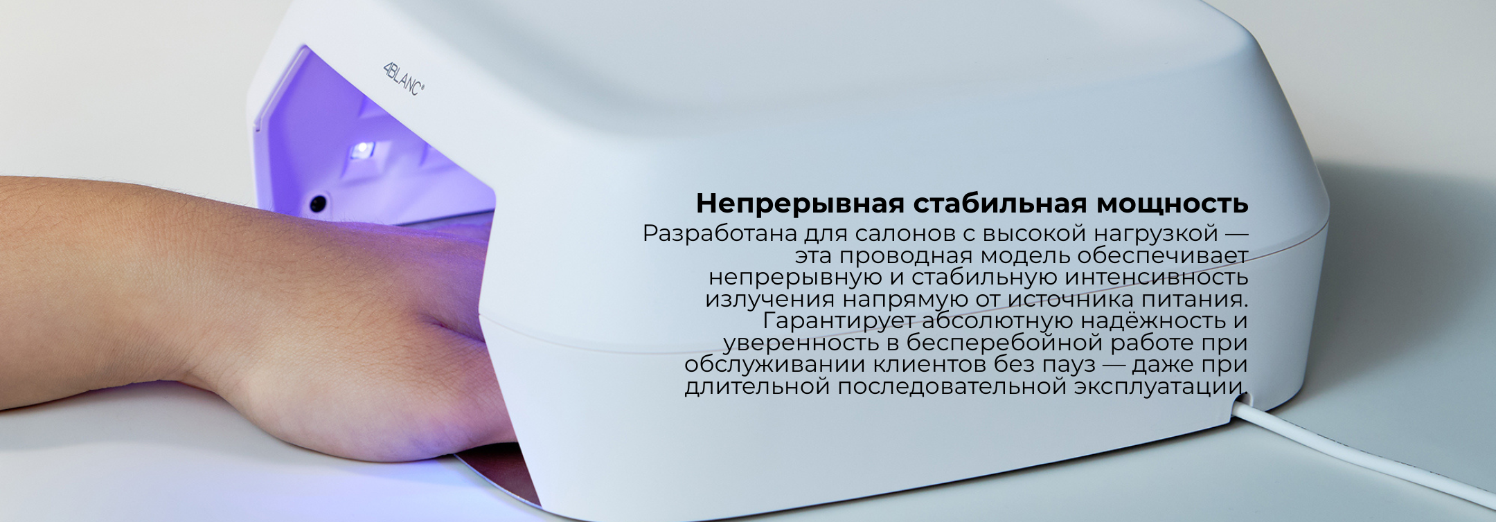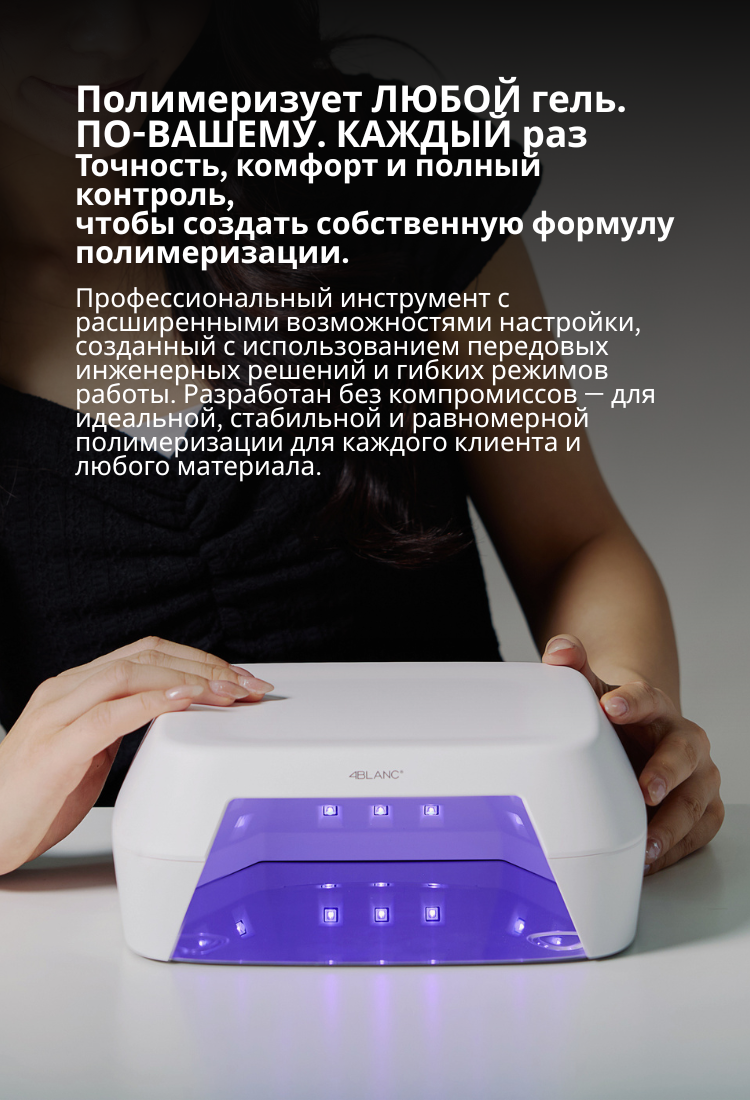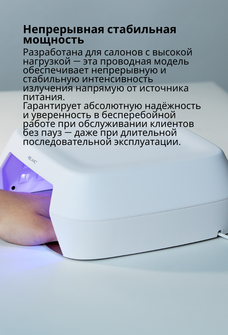 4BLANC Smart — это проводная UV/LED лампа для профессионального и домашнего использования, обеспечивающая быструю и равномерную полимеризацию всех гелевых материалов. Технология Pure Gold Wire гарантирует стабильный и равномерный свет на протяжении всего срока службы устройства.