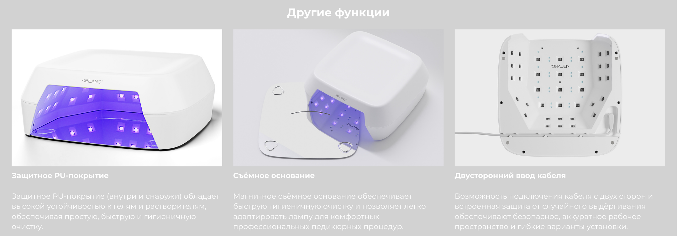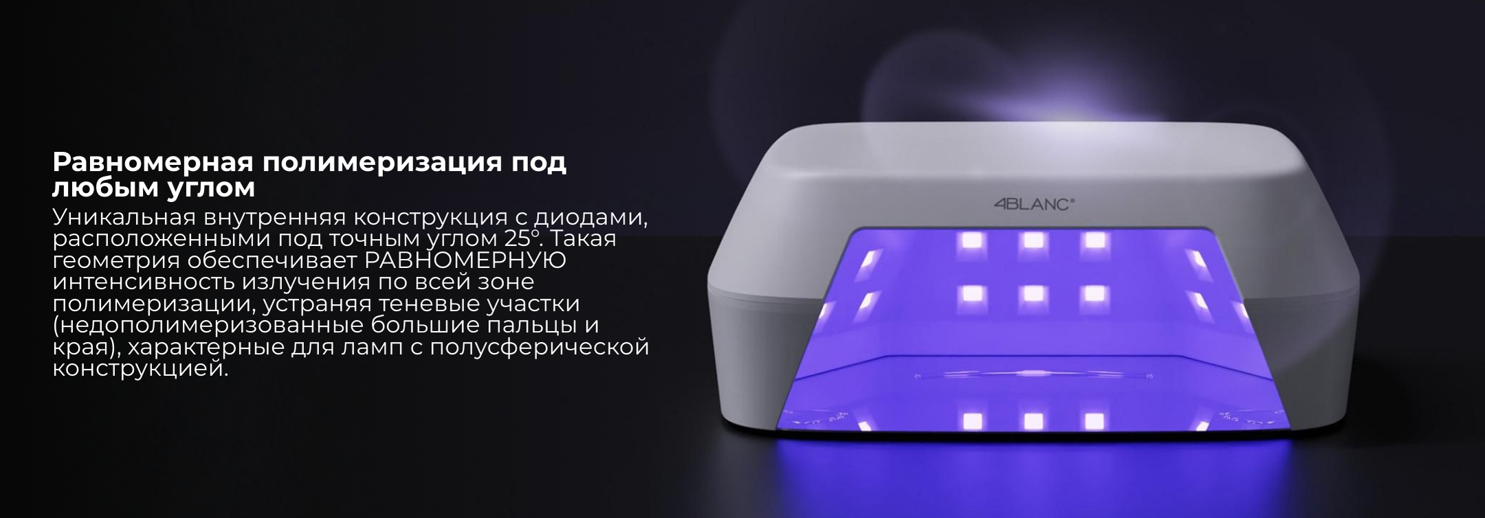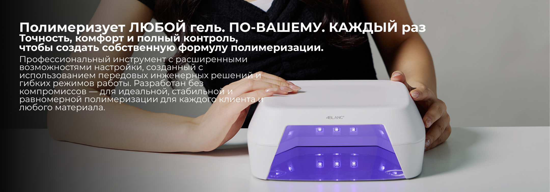 4BLANC Smart — это проводная UV/LED лампа для профессионального и домашнего использования, обеспечивающая быструю и равномерную полимеризацию всех гелевых материалов. Технология Pure Gold Wire гарантирует стабильный и равномерный свет на протяжении всего срока службы устройства.