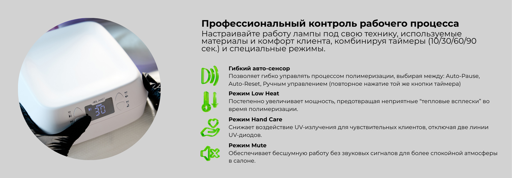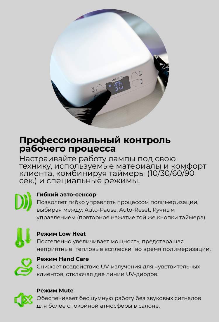 ✔ Многофункциональные режимы полимеризации — таймеры 10 / 30 / 60 / 90 сек, автоматический датчик движения, ручное управление и режим Low Heat для чувствительных ногтей